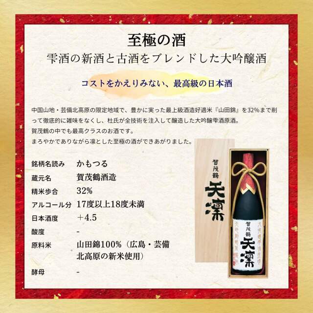 酒造好適米「山田錦」を32%まで削って徹底的に雑味をなくし、杜氏が全技術を注入して醸造した大吟醸雫酒原酒。賀茂鶴の中でも最高クラスのお酒です。