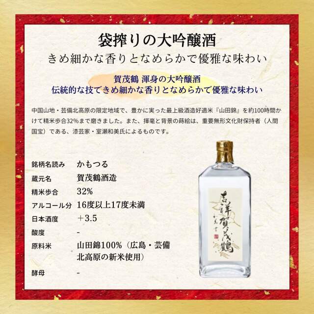 【アルコール度数】16度以上17度未満 【精米歩合】32% 【原材料】山田錦100%