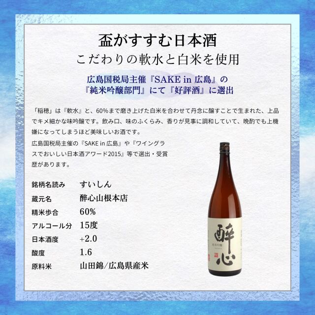 醉心山根本店が誇る「醉心 純米吟醸 稲穂」は、広島県三原市で生まれた上品な日本酒です。