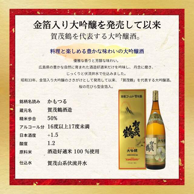 賀茂鶴 特製ゴールド賀茂鶴は、優雅な香りと芳醇な味わい。